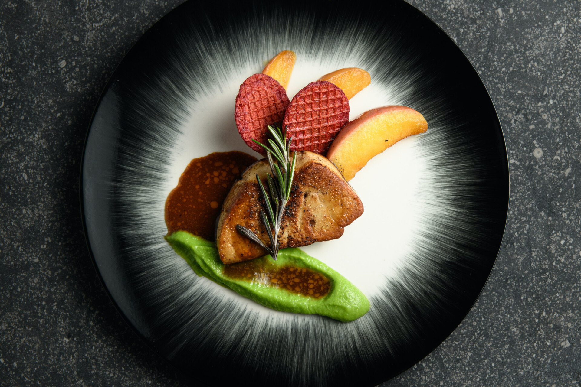 Gebakken ganzenlever met gekarameliseerde appeltjes, doperwtencrème en rode wijnjus